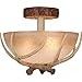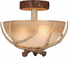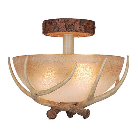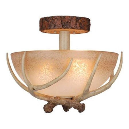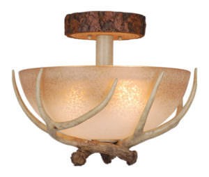 Bring a little nature indoors with the Lodge collection. Its wild look is warm and inviting yet interesting and stylish. The fixtures are designed to replicate the textural elements of pine tree bark and wood. The sculpted antlers are realistically detailed. French scavo glass shades complete the look. Everything combined makes this collection a great choice for a rustic vacation lodge, cabin or a suburban home. It will complement a variety of home styles: anywhere you want to bring in an element of nature. This semi flush mount ceiling light is ideal for hallway, living room, bedroom, Entryway or utility room. Assembly Required: Yes / Back Plate Height: 5.50 / Back Plate Width: 5.50 / Canopy Diameter: 7 / Bulb Shape: A19 / Dimable: Yes / Shade Included: Yes.