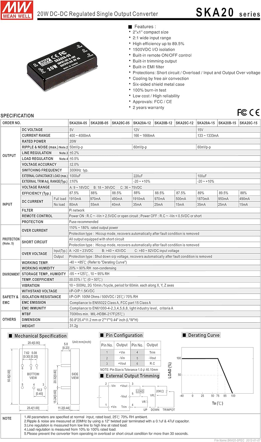MEAN WELL SKA20B-12 12V 166~1666mA 20W DC-DC Regulated Single Output Converter DC/DC Converter