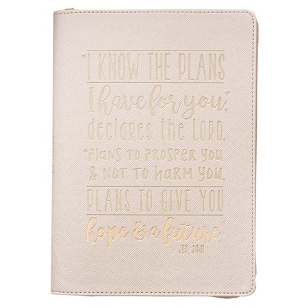 For I know the plans I have for you, declares the Lord, plans to prosper you and not to harm you, plans to give you hope and a future. Jeremiah 29:11 This elegantly designed journal features the verse from Jeremiah 29:11, making it the perfect gift for recent graduates or those choosing a new path in life. The writer can record their thoughts in great detail and be reminded that the Lord cares for them and where they are going on their journey. The cream colored textured LuxLeather with debossed foiled title give this journal a luxurious and stylish look and feel. A stitched border around the journal finishes off the overall look. This journal has a single zipper enclosure, allowing the user to keep their mementoes zipped securely with their written thoughts. The inside pages are lined and feature a Scripture verse for meditation each page. There is also a dedication page for gift givers to write a loving sentiment. Size: 5 3/4 (W) x 8 1/4 (H) 400 Lined Pages Soft LuxLeather Cover Attached Ribbon Page Marker Zipper Closure Presentation Page for Gift-Giving
