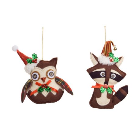 Pack of 6 Brown and White Owl and Raccoon Christmas Ornaments 10"