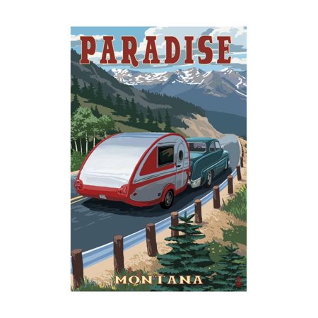 <ul> <li>Title: Paradise, Montana - Retro Camper</li> <li>Artist: Lantern Press</li> <li>Product Type: Art Print</li> </ul>