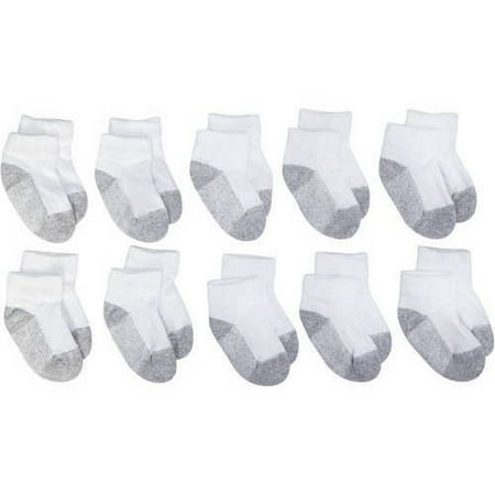 <br /> <b>Garanimals Newborn Baby Crew Socks, 10-Pack:</b> <ul> <li>Toddler crew socks</li> <li>White with grey foot</li> <li>Seamless crew socks have a comfort toe</li> <li>Soft, ringspun cotton</li> <li>Soft cushion sole</li> <li>Spandex for better fit</li> <li>Available in sizes 6-18 months, 18-36 months and 3-5 toddler</li> </ul>