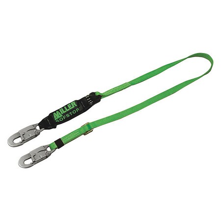 ' Shock-Absorbing Lanyard, Working Length 6 ft., Extended Fall Length 9-1/2 ft., Weight Capacity 310 lb., Number of Legs 1, Line Material Polyester, Hardware Material Steel, Color Green, Cable Dia. 1 In., Strap Width 1 In., Visual Load Indicator Yes, Locking Anchorage Connection Hook Type (1) Snap Hook, Anchorage Hook Gate Opening 3/4 In., Locking Harness Connection Hook Type Snap Hook, Harness Hook Gate Opening 3/4 In., Tensile Strength 5000 lb., Standards OSHA 1926.502, 1910.66; ANSI Z359.13 '