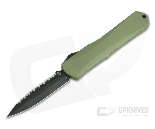Heretic Knives Manticore-X Double Edge Tumbled DLC Full Serrated Green OTF Automatic For Sale
