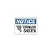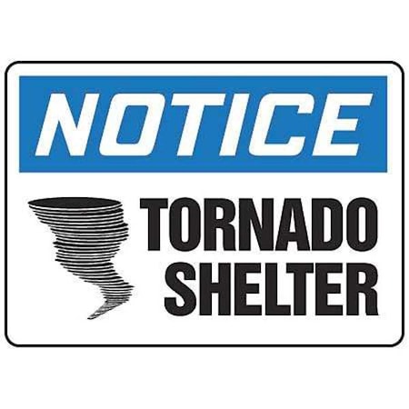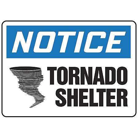 'Notice Sign, Subject Matter Exit , Entrance, and Evacuation, English, Legend Tornado Shelter, Legend Style Text and Symbol, Header Notice, Vinyl, Height 10 In., Width 14 In., Retroreflective Grade Not Retroreflective, Legend Color Black, Background Color White, Header Legend Color White, Header Background Color Blue, Mounting Style Adhesive-Backed, Sign Shape Rectangle'