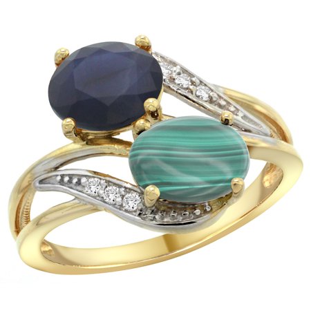 10K Yellow Gold Diamond Natural Australian Sapphire & Malachite 2-stone Ring Oval 8x6mm, sizes 5 - 10
