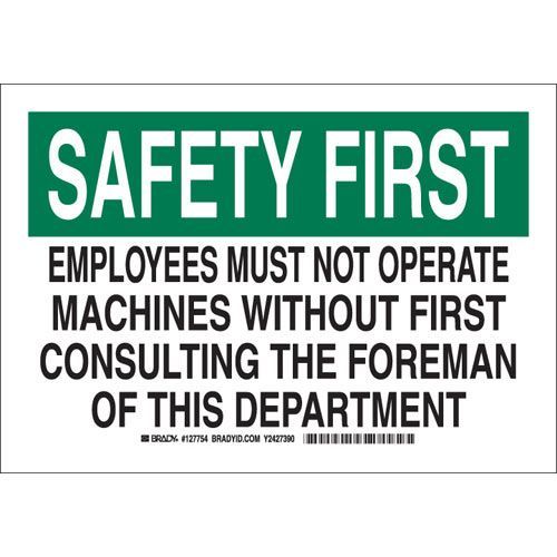 Brady 127754 SAFETY FIRST Employees Must Not Operate Machines Without First Consulting The Foreman Of This Department Sign - Self-sticking Polyester - Black/Green on White - 7 x 10