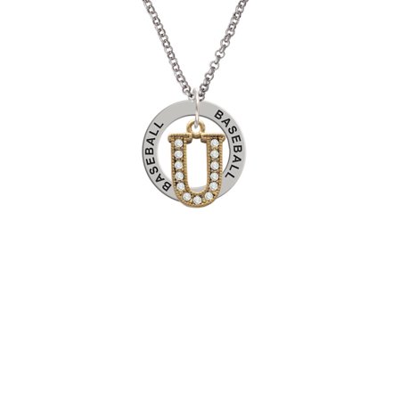 Gold Tone Crystal - U - Initial - Beaded Border Baseball Affirmation Ring Necklace. Gold Tone Charms. Charm size is approx. 0.73 x 0.48 x 0.11 inches (HxWxD) including loop. Silver tone 2mm Belcher Chain Necklace is approx. 23 Inches with a Lobster Claw Clasp. Affirmation Ring is approx. 0.86 x 0.86 x 0.05 (HxWxD). This inspirational piece of jewelry is very meaningful. Its circular shape is symbolic for endless belief in the message that is imprinted around the ring. These are motivational or sentimental messages to the wearer. Makes a great team gift! PLEASE NOTE: Our products are lead safe, but are not intended for children 14 years and younger.
