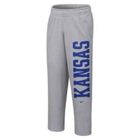 Kansas Jayhawks fleece pant 80% cotton, 20% by Nike. Features open hem with drawstring waist and side-seam pockets. School wordmark large screen print up left leg over a screen printed Nike swoosh.