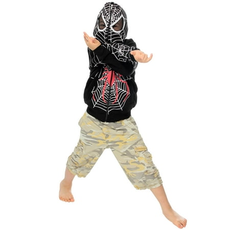 Features: <br /> <br />Boys will love this jacket, especially if they are a fan of the famous Spiderman. <br />The Spiderman theme makes this a great appeal, but it also has a unique style. <br />With the hood that zips all the way up and over the face, boys can have their face covered like the actual Spiderman himself! <br />You are able to see through with the eye holes. This is the perfect sweatshirt for Fall, and will be great for this time of year when Halloween rolls around! <br /> <br />Material: 100% Polyester <br />Color: Black <br />Size: 2: Length: 18.5", Chest: 30.3" <br />Size: 4: Length: 19.3", Chest: 31.9" <br />Size: 6: Length: 20.1 ", Chest: 33.5" <br />Size: 8: Length: 20.9", Chest: 35" <br />Size: 10: Length: 21.7 ", Chest: 36.6" <br />Size: 12: Length: 22.4 ", Chest: 38.2" <br />Size: 14: Length: 23.2 ", Chest: 39.8" <br /> <br /> <b>Package Includes:</b> <br />1 x Jacket
