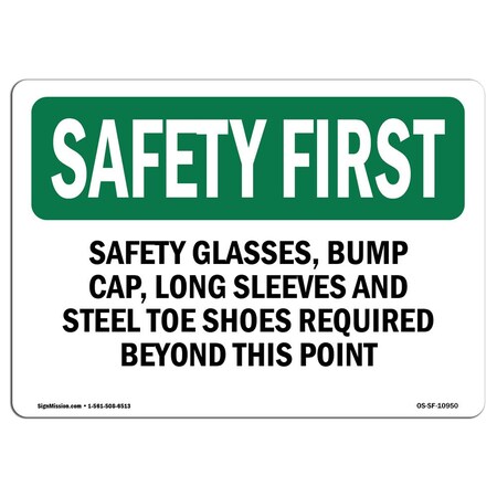 OSHA SAFETY FIRST Sign, Safety Glasses Bump Cap Long Sleeves And, 14in X 10in Decal