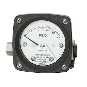 Mid-West 120-AA-00-O(CA)-10P Differential Pressure Gauge with Aluminum Body and Stainless Steel Internals, 1 Switch in Standard NEMA 4X Enclosure, Piston Type, 3/2/3% Full Scale Accuracy, 2-1/2" Dial, 1/4" FNPT Back Connection, 0-10 psid Range, 3000 psig SWP