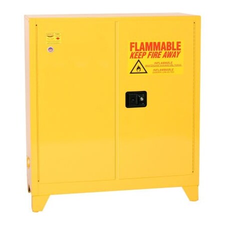 Eagle Flammable Liquid Tower Safety Cabinet with Self Close - 30 Gallon Eagle's 30 Gallon, self-closing, Tower Flammable Liquid Safety Cabinet is constructed of 18-gauge (1 mm) steel and has 4 in (10.2 cm) adjustable legs. The sides, top, bottom, and doors are double-walled with a 1-1/2 in (3.8 cm) air space between walls. Includes two vents, each have 2 in (5.1 cm) threaded fittings and a fire baffle and cap. Cabinets have a high gloss powder coat finish with red trilingual warning, plus grounding attachment, 3-point latch system, and 2-in (5.1 cm) raised, leakproof door sill. Each shelf is adjustable on 3 in (7.6 cm) centers, supported by 4 brackets, with a 350 lbs (159 kg) safe allowable load. Cabinets are FM-Approved and meet NFPA Code 30 and OSHA requirements. Features: Reinforced double wall construction with 1-1/2 in (3.8 cm) air space on sides, top, bottom, back and doors Constructed of 18-gauge steel Lead-free, high-gloss, baked-on powder finish Continuous piano hinges Ground connection Four adjustable 4 in (10.2 cm) legs help provide easy cleaning under cabinet and moving with a forklift or pallet jack Trilingual warning labels 2 in (5.1 cm) raised leakproof sill Patented adjustable galvanized steel shelves direct spills to back and bottom of leakproof sump and hold 350 lbs. (158.8 kg) Uniform Distributed Load (UDL) Internal and external welded construction Two 2 in (5.1 cm) internal vents with fire baffle and cap Flush mounted door handle with key lock Three-point stainless steel bullet latching system 3 in (7.6 cm) centers for shelf brackets Self-latching doors Door closings: Self-Closing (135° opening) Concealed self-close mechanism provides obstruction-free access to top shelf space Self-indexing doors guarantee they will close in sequence and ensure a tight closure from top to bottom Internal Dimensions: 39.5W x 14.562D x 39.5H Weights & Dimensions Depth 18 in Width 43 in Height 48 in Gauge 18 ga Weight 200 lbs