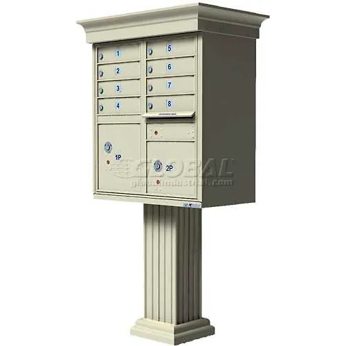 1570-8VSD Finish: Sandstone Features: -Accessory kit includes the mailbox, pedestal, crown molding top, and pillar pedestal. -Easy, snap on accessory installation makes it effortless to enhance your outdoor CBU installation. -Ideal for all residential and commercial developments. -1570 Florence CBU is an officially licensed product of the United States postal service. -Outgoing mail compartment with slot, anti-fish comb for security, and protective hood is located above USPS access door for convenient outgoing mail collection. -Cluster mailbox. Mount Type: -Post. Mailbox Type: -CBU Mailboxes. Number of Items Included: -2. Country of Manufacture: -United States. Dimensions: Overall Height - Top to Bottom: -65.13". Overall Width - Side to Side: -33.9". Overall Depth - Front to Back: -21.4". Overall Product Weight: -182 lbs.