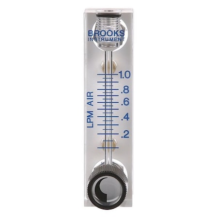 'Mechanical Flowmeter, Mechanical Flowmeter, For Pipe Size 1/8 In. to 1 In., Connection Size 1/8 In., Connection Type FNPT, Fluid Temp. Range 40 Degrees to 150 Degrees F, Wetted Materials Clear Acrylic, Stainless Steel, Viton, Max. Pressure 100 psi, Flow Range .1 to 1 lpm, Max. Viscosity 79.8 SSU, Flow Material Air, Variable Area, Width 1 In., Height 4 In., Housing Material Acrylic, Fitting Stainless Steel, Seal Material Viton'