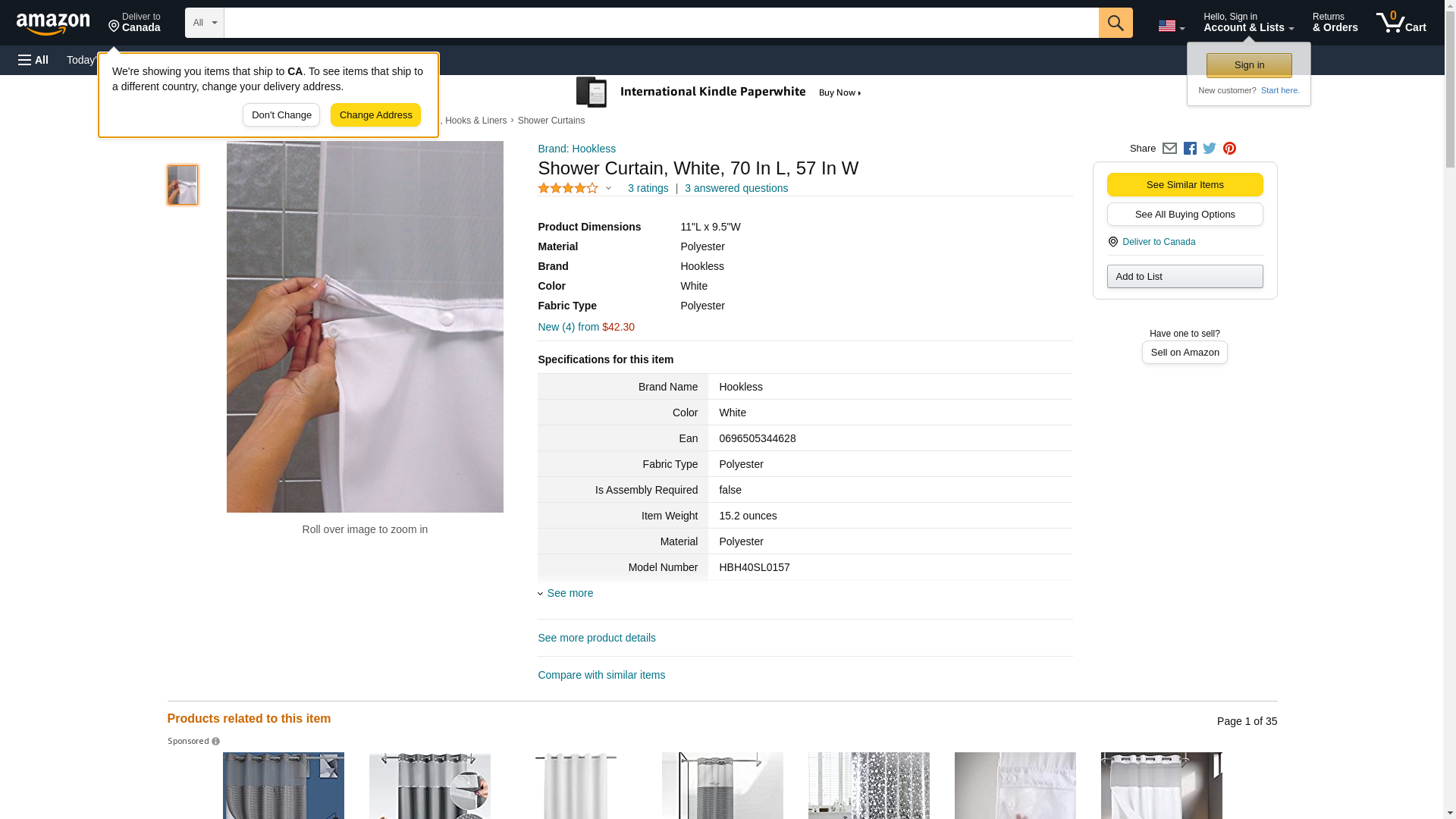 - Price For: Each Length: 57" Item: Shower Curtain Liner Color: White Mounting Type: Snap-in Width: 70" Pattern: None Material: Polyester Country of Origin (subject to change): China