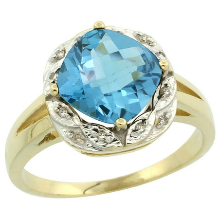 14K Yellow Gold Natural Swiss Blue Topaz Ring Cushion-cut 8x8mm Diamond Halo, sizes 5-10