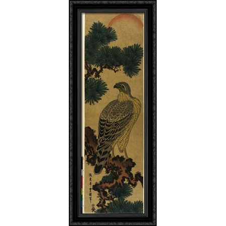 Kachoga. Falcon on a pine branch, rising sun above 16x40 Large Black Ornate Wood Framed Canvas Art by Utagawa Toyokuni II