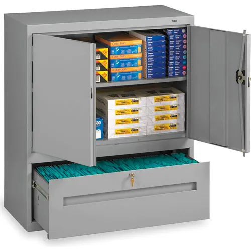 TENNSCO Storage Cabinet with File Drawer gives you both a lateral file drawer for hanging files and a storage cabinet for office supplies. Reinforced doors open and close quietly on leaf hinges that help maintain proper alignment. Chrome handle secure doors via a 3-point locking mechanism. Cabinet shelves adjust up or down in 2" increments. Full-width recessed handle pulls file drawer out smoothly. Both cabinet doors and file drawer lock separately., Lot of 1