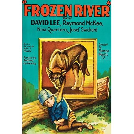 German Shepherd paws a young boy sleeping on a log Poster Print by Unknown