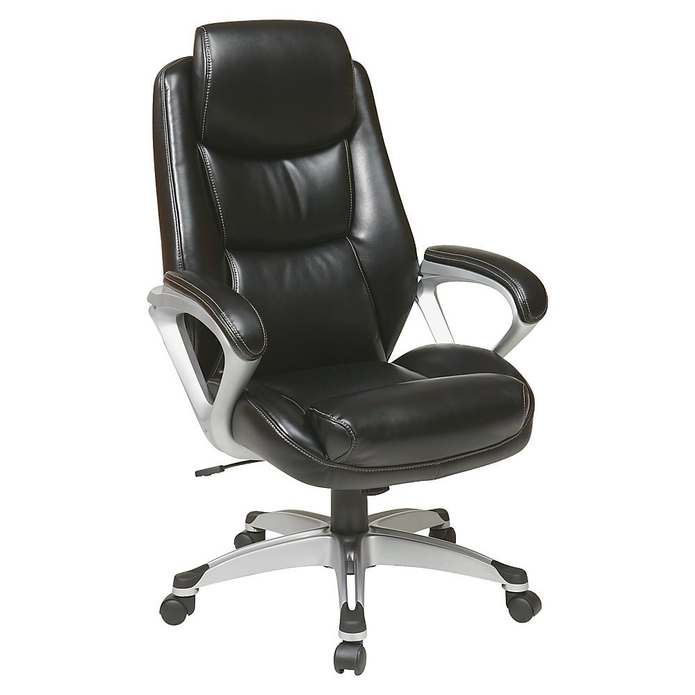 Executive high-back chair features a deluxe look and comfort features to match. Cushioned back offers built-in lumbar support and a headrest. Seat includes a thick cushion and coil-spring seating comfort. Fixed arms offer a padded loop design and silver-coated accents. Seat, back and arms are covered in Black Eco Leather. Heavy-duty, silver-colored five-star base has black endcaps and dual-wheel casters for stability and easy mobility. Functions include one-touch pneumatic seat-height adjustment from 18-1/2" to 21-1/4", 360-degree swivel and locking tilt control with adjustable tilt tension. Weight capacity is 250 lb. Seat size is 21" wide x 19-1/4" deep x 4-1/2" thick. Back measures 21-1/4" wide x 4-1/2" thick x 27" high.