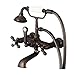 F6-0010-03-AX Style: Cross Handles, Finish: Oil Rubbed Bronze Features: -Tub faucet.-Material: Solid brass and porcelain.-Installation type: Wall or inside bathtub mount.-Valve type: Ceramic disc.-Number of faucet holes: 2.-Faucet centers: Adjustable.-Great for replacing an existing roman tub filler.-Vacuum breaker backflow prevention and arched spout allows code compliant installation.-Flow rate: 4.85 GPM at 60 PSI.-Spout reach: 7.5".-Faucet centers: 7". Includes: -Lifetime warranty 0.25 turn drip free ceramic disc cartridges and matching finish handheld shower included. Color/Finish: -5 Foot coiled hose in matching finish and special designed spout to avoid a restricted flow. Specifications: -Arched spout allows outside diameter compliant installation and designed to meet 100 psi water test pressure. Dimensions: -Height: 9".-Hose length: 60". Collection: -Vintage Classic collection.