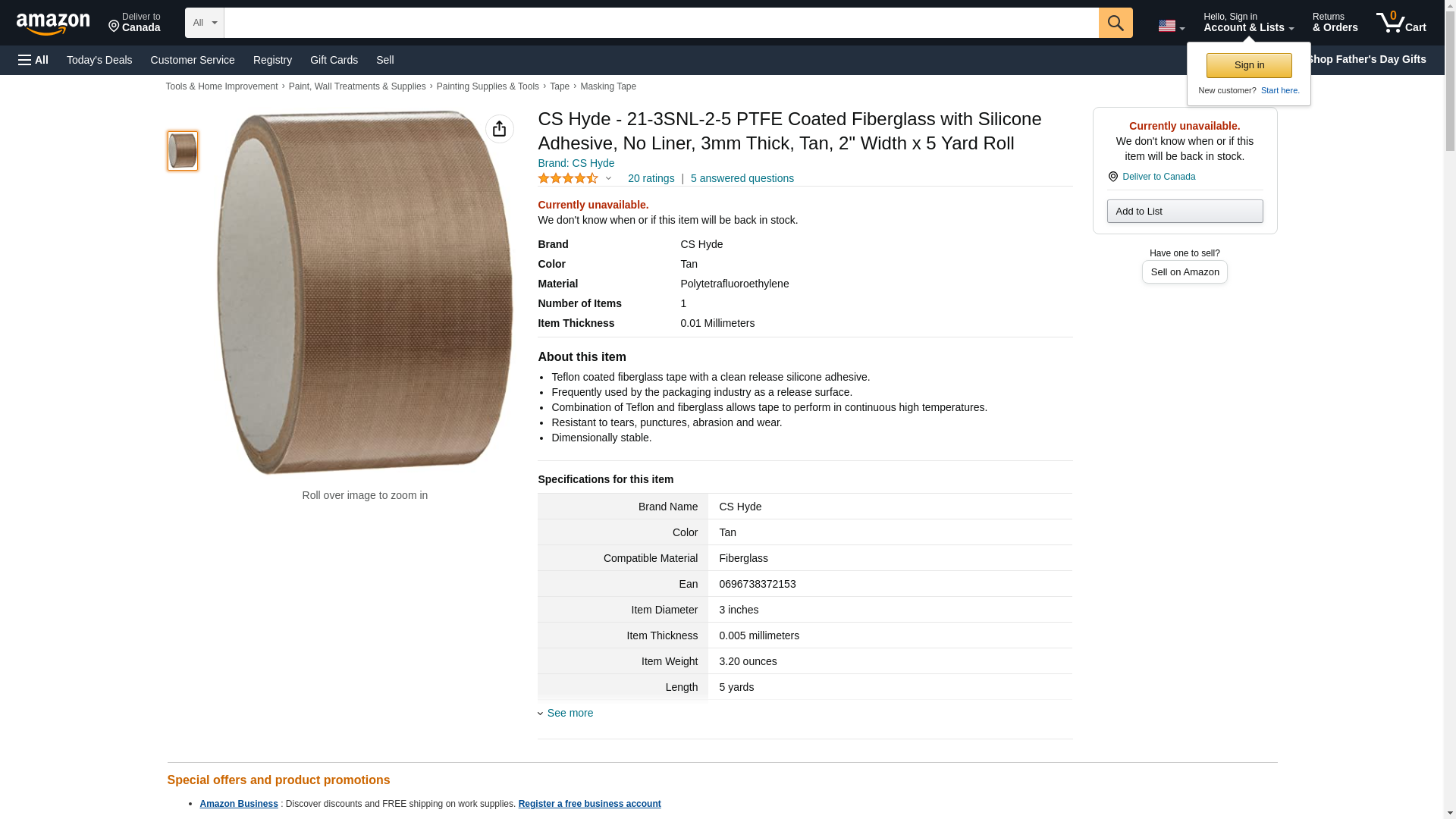 CS Hyde PTFE Coated Fiberglass with Silicone Adhesive, No Liner, 3mm Thick, Tan, 2" Width x 5 Yard Roll. Teflon coate...