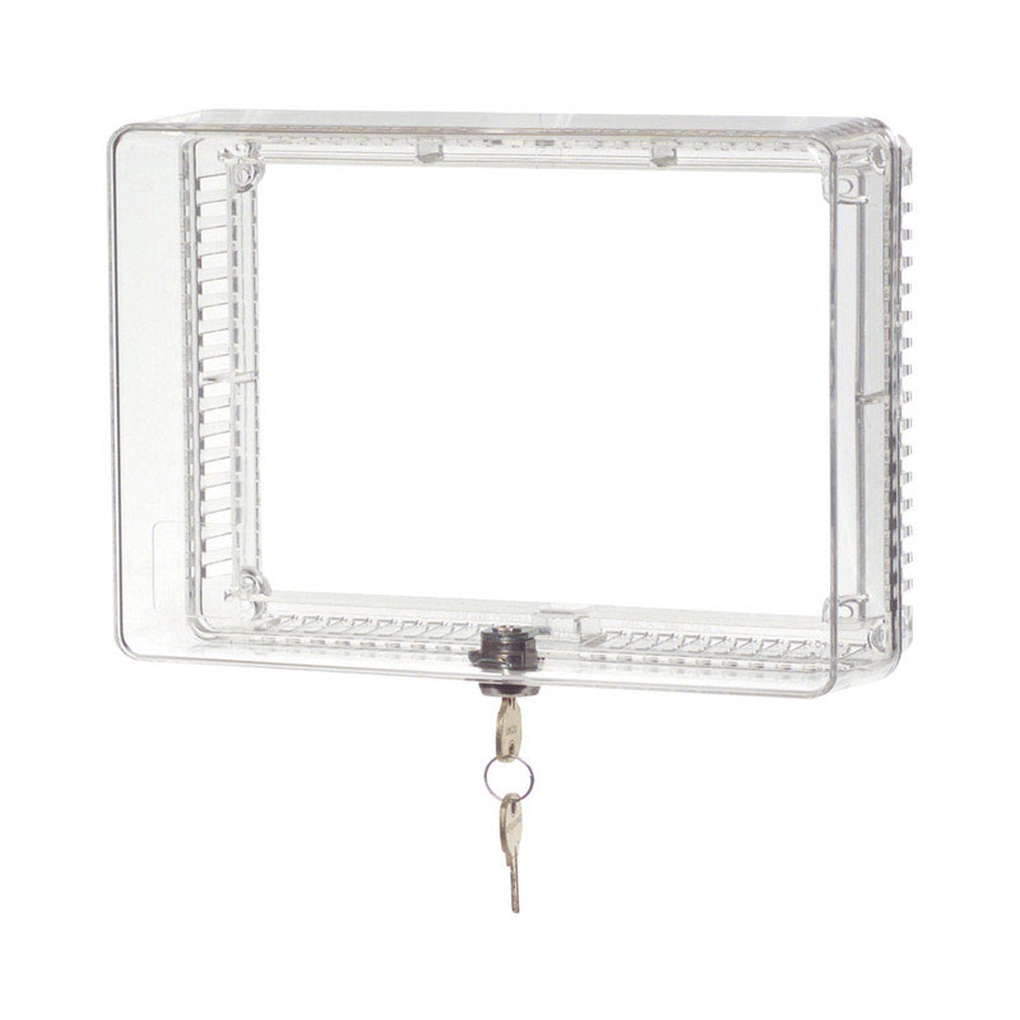 Ultra-clear chemical and UV-resistant acrylic resin cover and base resist yellowing. Secure, tumbler type key lock; key removable only in locked position. Double-wall barrier in ring base blocks thermostat tampering tools, yet allows air circulation. Ring base mounts directly over existing thermostat; no removal required. Meets or exceeds UL pry test and impact test standards. All covers are keyed alike.