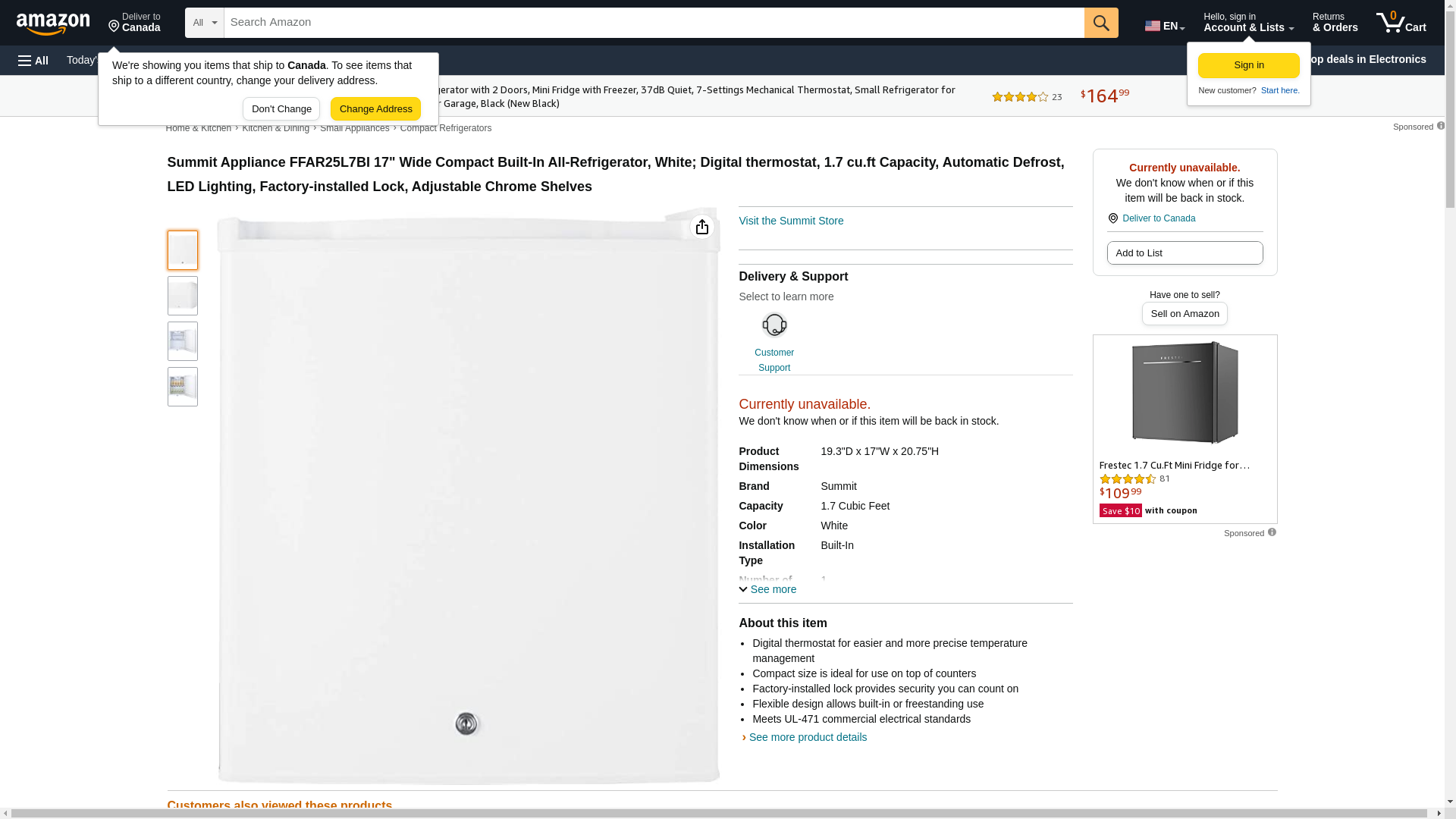 Summit Appliance FFAR25L7BI 17" Wide Compact Built-In All-Refrigerator, White; Digital thermostat, 1.7 cu.ft Capacity, Automatic Defrost, LED Lighting, Factory-installed Lock, Adjustable Chrome Shelves<br><br> Key Features<br> - Digital thermostat for easier and more precise temperature management<br> - Compact size is ideal for use on top of counters<br> - Factory-installed lock provides security you can count on<br> - Flexible design allows built-in or freestanding use<br> - Meets UL-471 commercial electrical standards<br> - Automatic defrost operation minimizes user maintenance<br><br> Specifications<br> - Height of Cabinet: 20.25"<br> - Height to Hinge Cap: 20.75"<br> - Width: 17"<br> - Width with Door Open: 17.75"<br> - Depth: 19.13"<br> - Depth with door at 90 degrees: 34.25"<br> - Capacity: 1.7 cu.ft<br> - Defrost Type: Automatic<br> - Door: White<br> - Cabinet: White<br> - US Electrical Safety: ETL<br> - Canadian Electrical Safety: ETL-C<br> - Amps: 1.3<br> - Voltage/Frequency: 115 V AC/60 Hz<br> - Door Swing: RHD<br> - Reversible: Yes<br> - Shelf Type: Chrome<br> - Shelf Qty: 2<br> - Adjustable Shelves: Yes<br> - Thermostat Type: Digital<br> - Refrigerant Type: R600a<br> - Refrigerant Amount: 0.6 oz<br> - High Side PSI: 270<br> - Low Side PSI: 103<br> - Interior Light: Yes<br> - Temperature Range: 34 to 43 degrees Fahrenheit<br> - Interior Height: 16.5"<br> - Interior Width: 13.75"<br> - Interior Depth: 15"<br> - Compressor Step Height: 8"<br> - Compressor Step Width: 13.75"<br> - Compressor Step Depth: 6"<br> - Dimensions (HxWxD): 20.75" x 17" x 19.3"<br> - Weight: 55 lbs<br><br>