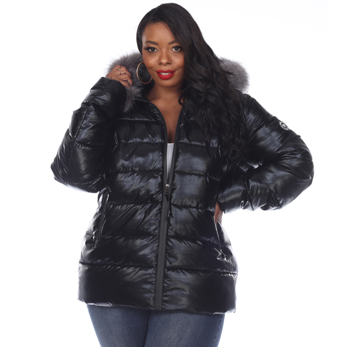 White Mark PS926-01-2X Plus Size Metallic Puffer Coat with Hoddie, Black - 2X