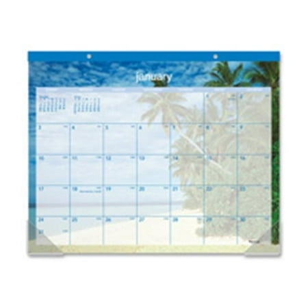 Desk pad offers convenient monthly planning with a different beach photo each month. The photo is ghosted behind the calendar grid. Planning pages range 12 months from January to December. One-page-per-month format includes unruled daily blocks (3" x 2"), Sunday-through-Saturday scheduling, Julian dates, holidays, and past and future months reference. Desk calendar also features a blue headband and two clear corners to hold pages in place. Use two eyelets for hanging to turn the desk pad into a wall calendar.