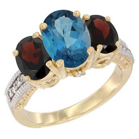 14K Yellow Gold Diamond Natural London Blue Topaz Ring 3-Stone Oval 8x6mm with Garnet, sizes5-10