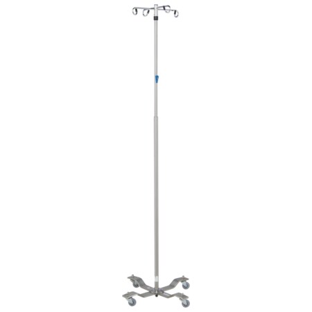 The Blickman 8889SS-4 Stainless Steel, 4-Leg IV Stands feature a high quality, heavy-duty weighted stainless steel flat bar base designed for stability and ease of cleaning and are offered in an automatic thumb-operated height adjustment. (4-hook ram's horn hooks). The 8889SS-4 is height adjustable from 66" to 100".