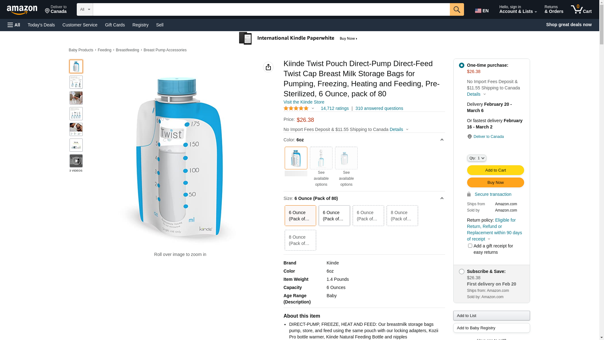 Kiinde Twist Pouch Direct-Pump Direct-Feed Twist Cap Breast Milk Storage Bags for Pumping, Freezing, Heating and Feeding, Pre-Sterilized, 6 Ounce, pack of 80