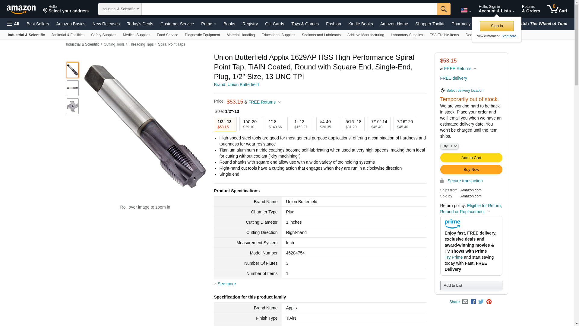 Union Butterfield Applix 1629AP HSS High Performance Spiral Point Tap, TiAlN Coated, Round with Square End, Single-End, Plug, 1/2" Size, 13 UNC TPI