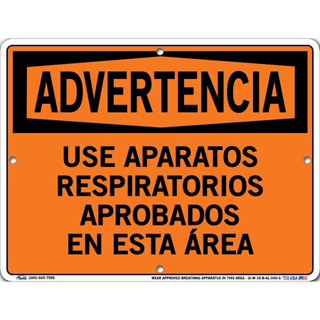 Vestil SI-W-18-B-AL-040-S WEAR APPROVED BREATHING APPARATUS IN THIS AREA/USE APARATOS RESPIRATORIOS APROBADOS EN ESTA ÁREA Warning Sign, Aluminum, 0.040" Overall Size, 12.5" W x 9.5" H