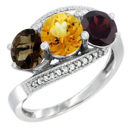 14K White Gold Natural Smoky Topaz, Citrine & Garnet 3 stone Ring Round 6mm Diamond Accent, sizes 5 - 10