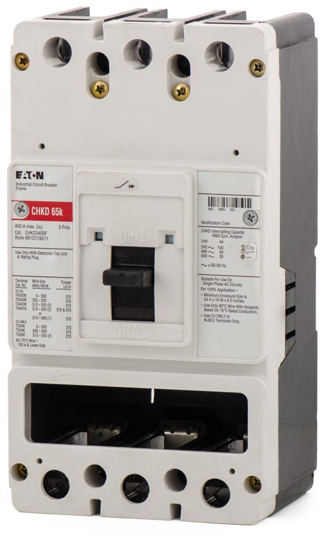 Mfr Brand Name: CUTLER HAMMER / Catalog No.: CHKD3400F / Product Name: CUTLER HAMMER CHKD3400F N 400A 600V 3P NEW / Amps: 400 / Volts: 600 / Poles: 3