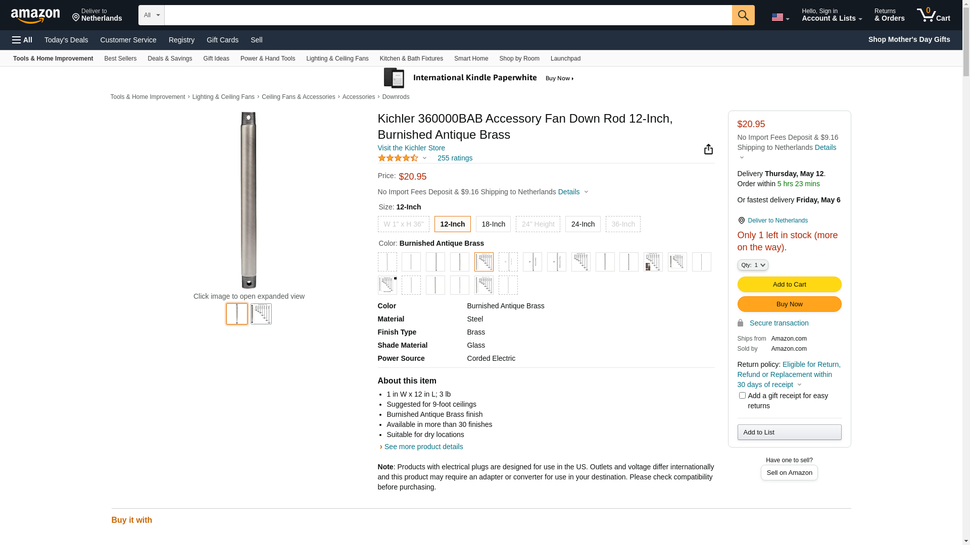 Kichler 360000BAB Accessory Fan Down Rod 12-Inch, Burnished Antique Brass