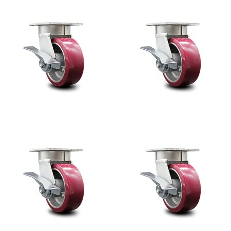 Kingpinless Polyurethane on Aluminum Swivel Top Plate Caster Set of 4 w/5" x 2" Maroon Wheels - Includes 4 Swivel w/Side Lck Brakes - 3600 lbs Total Capacity - Service Caster Brand