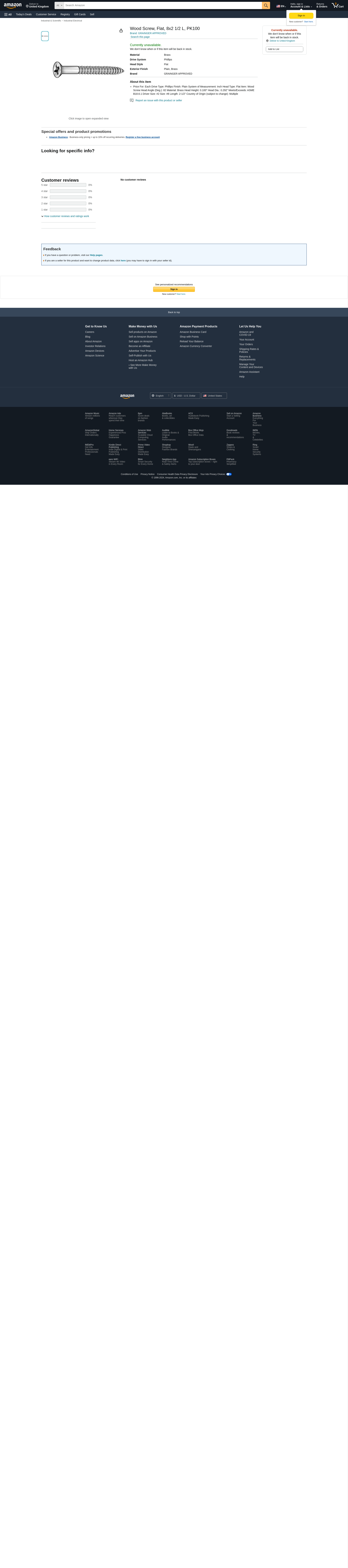 | Feature | Price For: Each Drive Type: Phillips Finish: Plain System of Measurement: Inch Head Type: Flat Item: Wood Screw Head Angle (Deg.): 82 Material: Brass Head Height: 0.100" Head Dia.: 0.292" Meets/Exceeds: ASME B18.6.1 Driver Size: #2 Size: #8 Length: 2-1/2" Country of Origin (subject to change): Multiple |