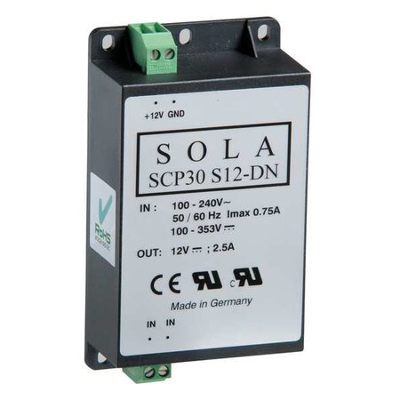 | Feature | SOLA HEVI DUTY SCP30S12-DN AC-DC CONV, DIN RAIL, 1 O/P, 30W, 2.5A, 12V |