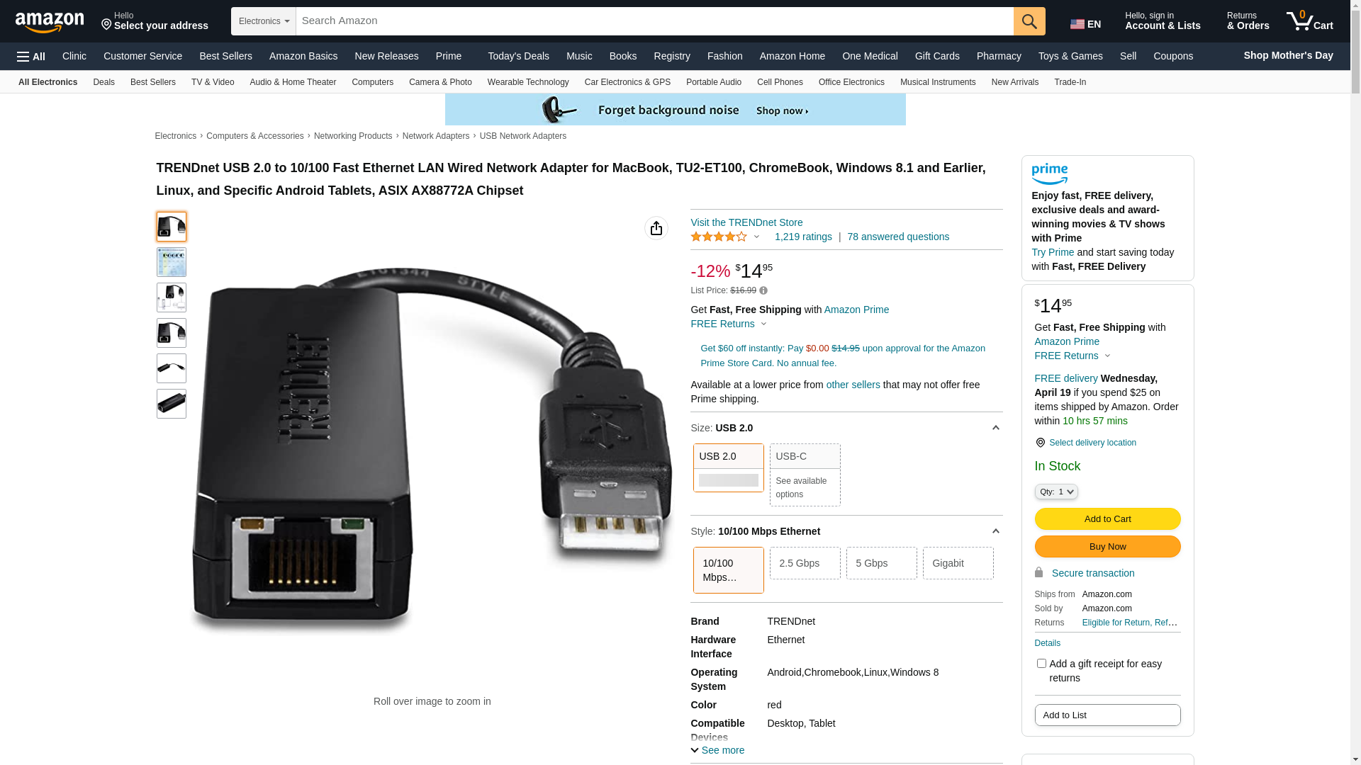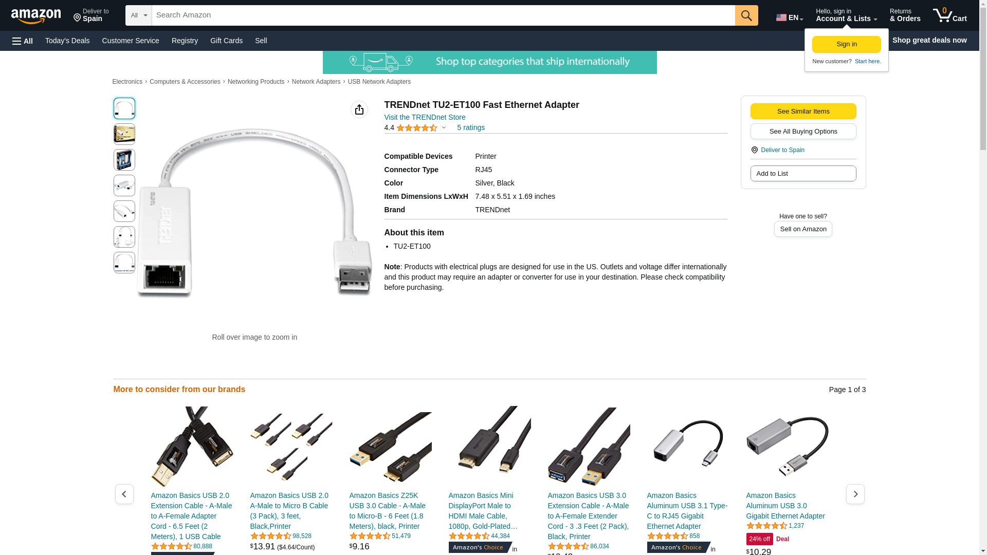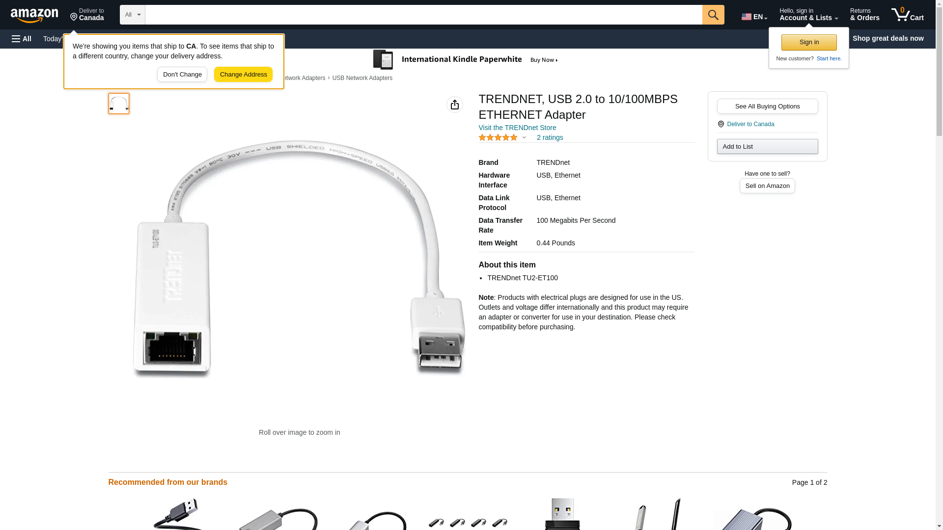 Shipping Depth: 7.6 Shipping Height: 1.4 Shipping Width: 5.4 Master Pack Qty: 40 General Information Manufacturer: TRENDnet Manufacturer Part Number: TU2-ET100 Brand Name: TRENDnet Product Model: TU2-ET100 Product Name: TU2-ET100 Fast Ethernet Adapter Marketing Information: The TU2-ET100 is a high speed USB network adapter that allows you to instantly connect to a 10/100Mbps network from a USB enabled desktop or Notebook PC. Compliant with USB 2.0 and backwards compatible with the USB 1.0 and 1.1, you can share files and printers and also gain access to broadband Internet to explore valuable resources on the web. Product Type: Fast Ethernet Card Interfaces/Ports Host Interface: USB Number of Ports: 1 Interfaces/Ports: 1 x Type B Interfaces/Ports: 1 x RJ-45 Network Communication Network Technology: 10/100Base-TX Physical Characteristics Form Factor: External Height: 0.9 Width: 3.2 Depth: 2.1 Weight (Approximate): 2.40 oz Miscellaneous Package Contents: TU2-ET100 Fast Ethernet Adapter Multi-Language Quick Installation Guide CD-ROM (Driver and user's guide) Green Compliant: Yes Green Compliance Certificate/Authority: RoHS Green Compliance Certificate/Authority: WEEE Warranty Standard Warranty: 3 Year Limited