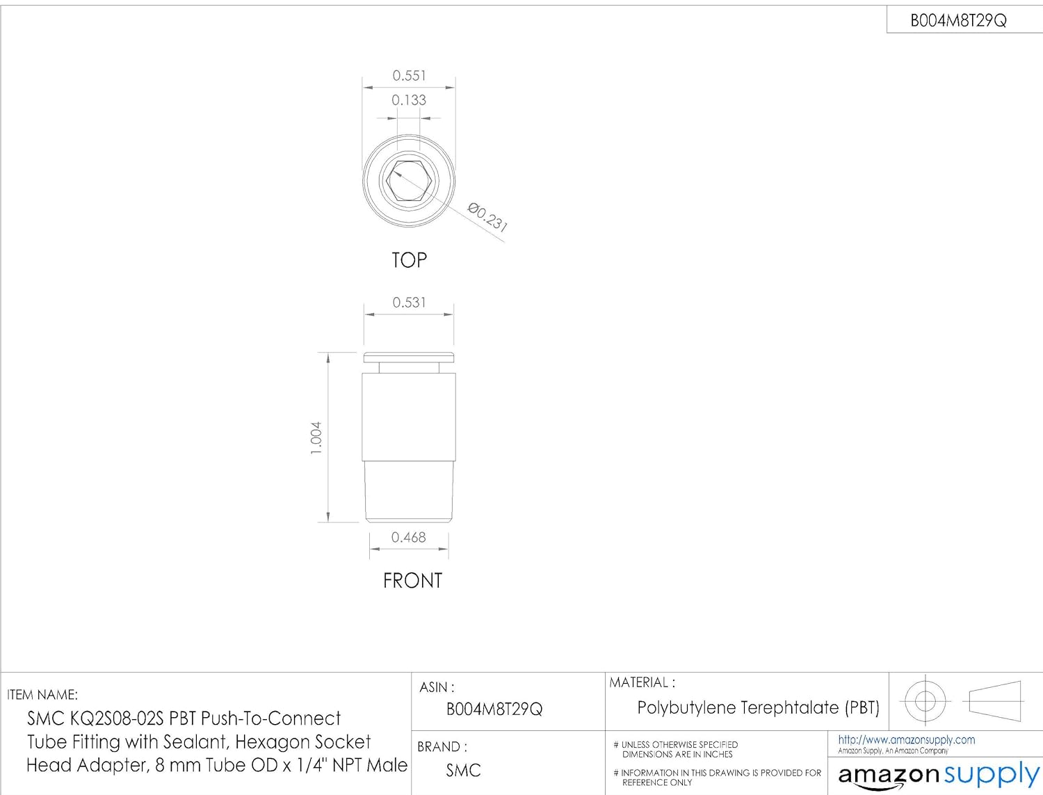 SMC KQ2S06-01AS Brass Push-to-Connect Tube Fitting with Sealant, Hex Socket Head Adapter, 6 mm Tube OD x 1/8" BSPT Male