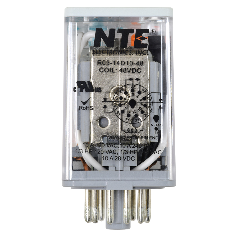 NTE Electronics R03-14D10-48 Series R3 General Purpose Full-Feature DC Relay, 3PDT Contact Arrangement, 10 Amp, 11 Pin Octal Plug, 48 VDC