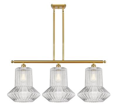 INNOVATIONS LIGHTING 516-3I-SG-G212 Springwater 3 Light Island Light part of the Ballston Collection. The Springwater 3 Light Island Light is part of the Ballston Collection. Includes 10 Feet Wire. Includes 2-6 and 4-12 inch Stems. Additional Stems sold separately. Solid Brass 90 Degree Hang Straight Swivel for Sloped Ceilings Included. Collection: Ballston. Material: Steel, Cast Brass, Glass. Metal Finish(Body): Satin Gold. Metal Finish(Canopy/Backplate): Satin Gold. Dimension(in): 36(W) x 16(H) x 12(Ext). Minimum Height (Fixture Height with Shade, Cord or Included Stems & Canopy)(in): 25.375. Max Height (Fixture Height with Cord or Included Stems & Canopy)(in): 49.375. Wire/Cord: 10 Feet Of Wire. Bulb: (3)100 Medium Base Vintage Bulb recommended(Not Included). Voltage: 120. Glass: Clear Spiral Fluted Springwater/Transparent; Ribbed. Shade Shape: Novelty. Shade Material: Glass. Shade Size(in): 12 X 12. Shade Fitter Measurement: Neckless with a 2.125 inch Hole. Canopy Dimension(in): 6 x 4.5 x.75. Solid Brass 90 Degree Hang Straight Swivel for Sloped Ceilings Included. UL/CUL Damp Rated. Warranty: 2 Year Finish, Lifetime Electrical.
