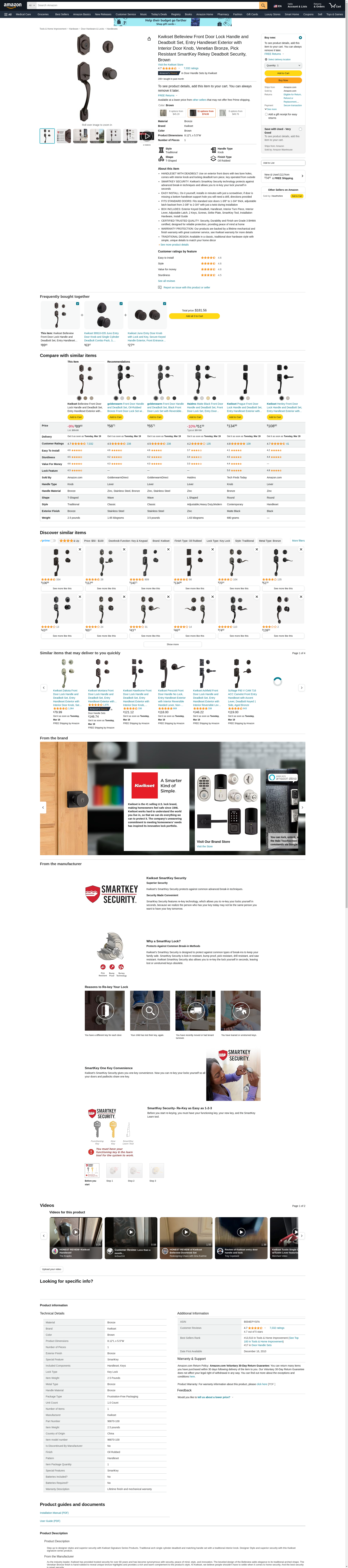 - BOX INCLUDES: Exterior Keyed Deadbolt, Handleset, Interior Turn Piece, Interior Lever, Adjustable Latch, 2 Keys, Screws, Strike Plate, SmartKey Tool, Installation Hardware, Install Guide