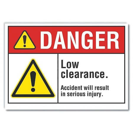 Danger Sign, Horizontal Rectangle, Number of Printed Sides 1, English, Sign Format ANSI/OSHA Format, Sign Legend Low Clearance. Accident Will Result In Serious Injury., Sign Legend Background Color White, Sign Legend Style Symbol and Text