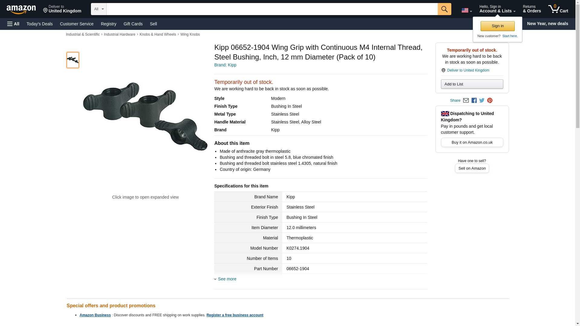 Kipp 06652-1904 Wing Grip with Continuous M4 Internal Thread, Steel Bushing, Inch, 12 mm Diameter (Pack of 10)