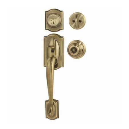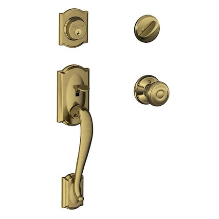 Schlage F60 V CAM 609 GEO Camelot Front Entry Handleset with Georgian Knob, Deadbolt Keyed 1 Side, Antique Brass